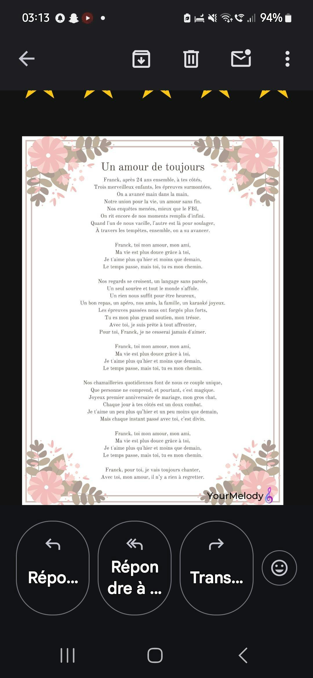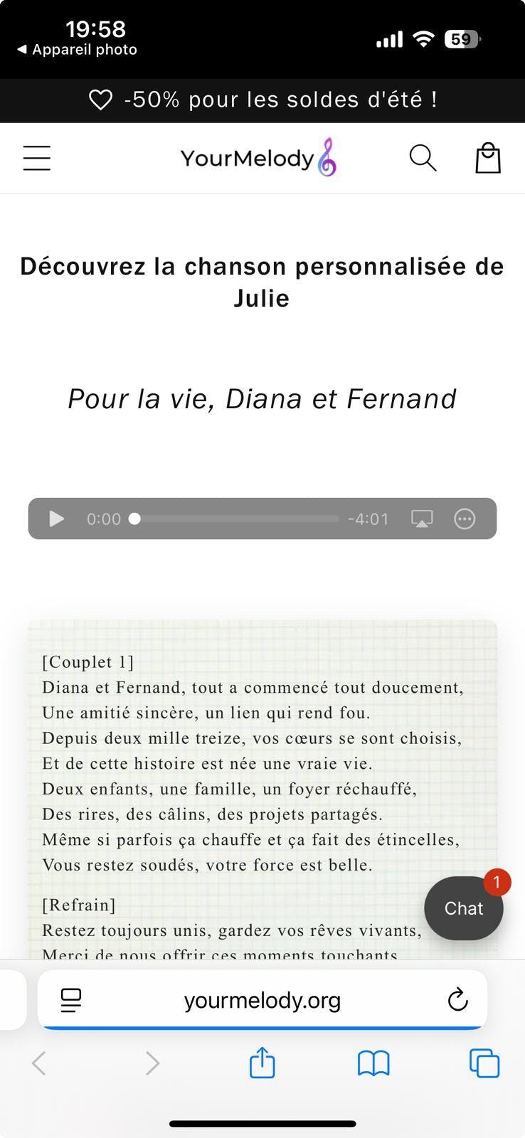 Merci à toute l'équipe, superbes paroles et super mélodie. Reçue en 24 h. Aucune modification à faire. Contact agréable et rapide avec l'équipe.