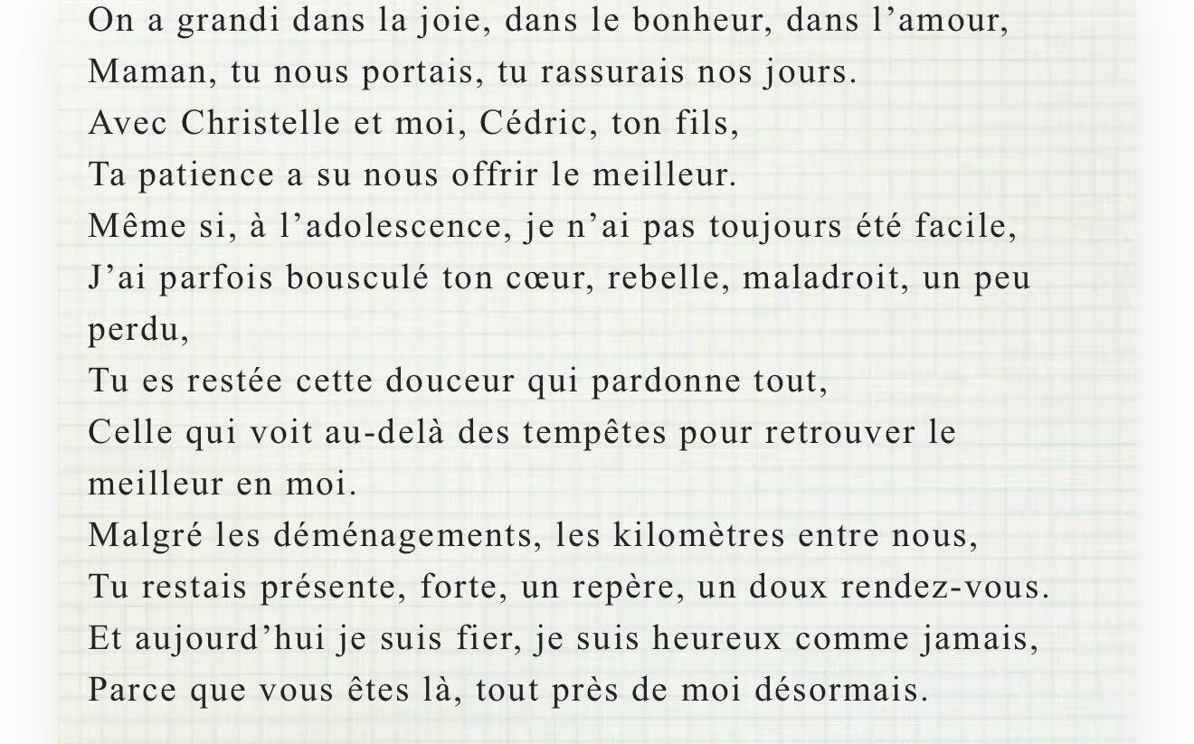 Nous sommes totalement ravis du résultat 😍 l’émotion de mon conjoint était présente comme je voulais 🥹 La musique qui accompagne les paroles est hyper accordée et extrêmement bien chantée 👍🏼